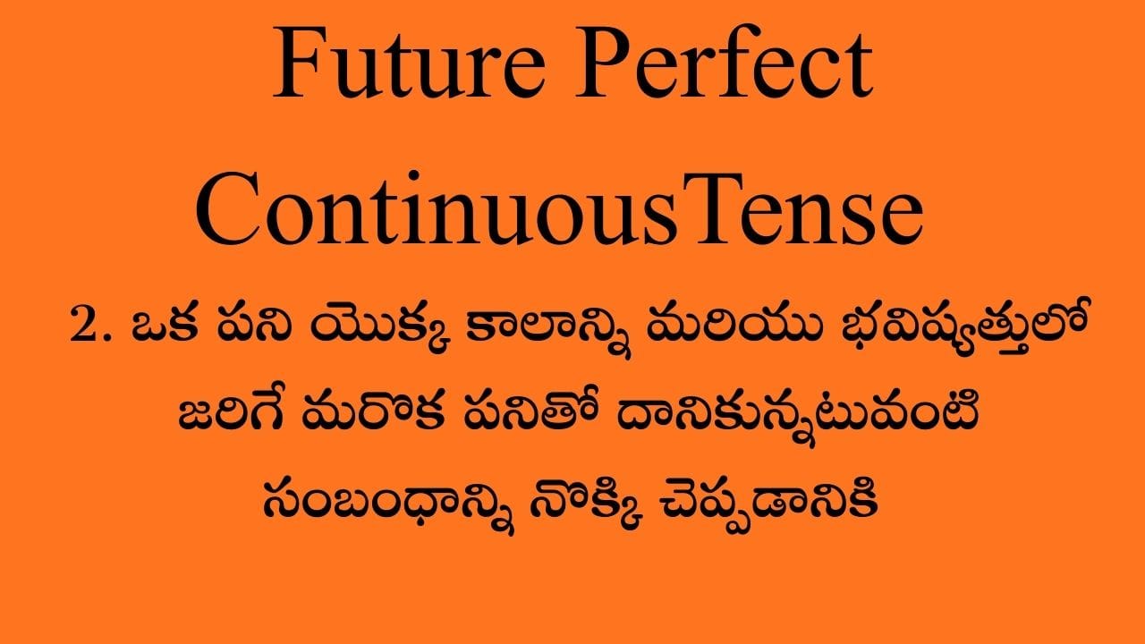ఒక పని యొక్క కాలాన్ని మరియు భవిష్యత్తులో జరిగే మరొక పనితో దానికున్నటువంటి సంబంధాన్ని నొక్కి చెప్పడానికి కూడా Future perfect continuous tense ఉపయోగిస్తారు.