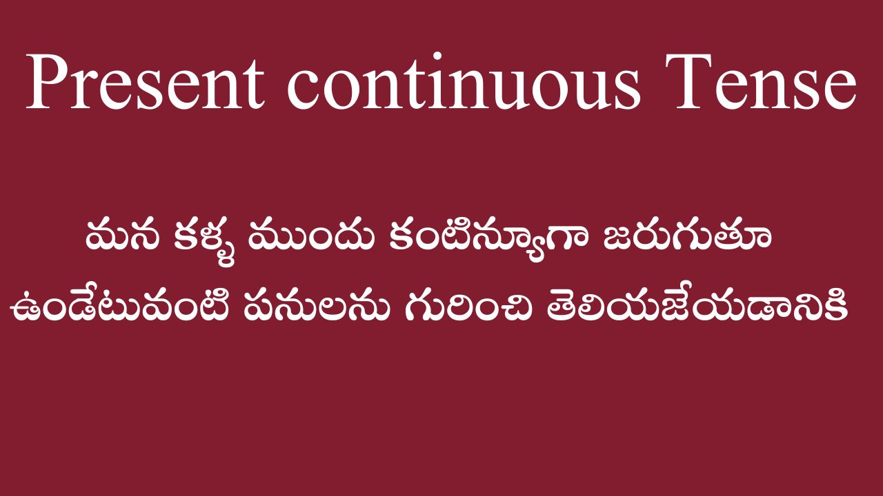 ప్రస్తుతం అనగా ఇప్పుడు కంటిన్యూగా జరుగుతూ ఉండేటువంటి పనులను గురించి తెలియజేయడానికి Present continuous tense ని ఉపయోగిస్తారు