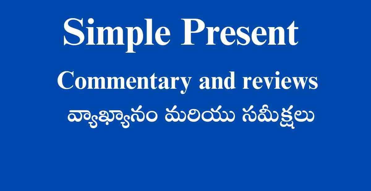ఒక సినిమా గురించి గానీ, కథ గురించి గానీ , ఒక పుస్తకం మీద గాని, ఒక వీడియో మీద గాని, కామెంట్ చేయడానికి. లేదా ఏవైనా క్రీడలు లైవ్ జరుగుతున్నప్పుడు Live కామెంట్రీ చెప్పడానికి కూడా ఈ సింపుల్ ప్రెసెంట్ టెన్స్ ని ఉపయోగిస్తారు. ఈ పనులు ఆల్రెడీ కొద్ది నిమిషాల ముందు జరిగిపోయి ఉంటాయి. కానీ కామెంట్ చేస్తున్నాం కాబట్టి సింపుల్ ప్రెసెంట్ టెన్స్ లో తెలియజేస్తారు. కానీ ఈ వాక్యాల అర్ధాన్ని తెలుగులో రాసినప్పుడు ఆ పనులు జరిగిపోయినట్లుగానే రాయడం జరుగుతుంది.
