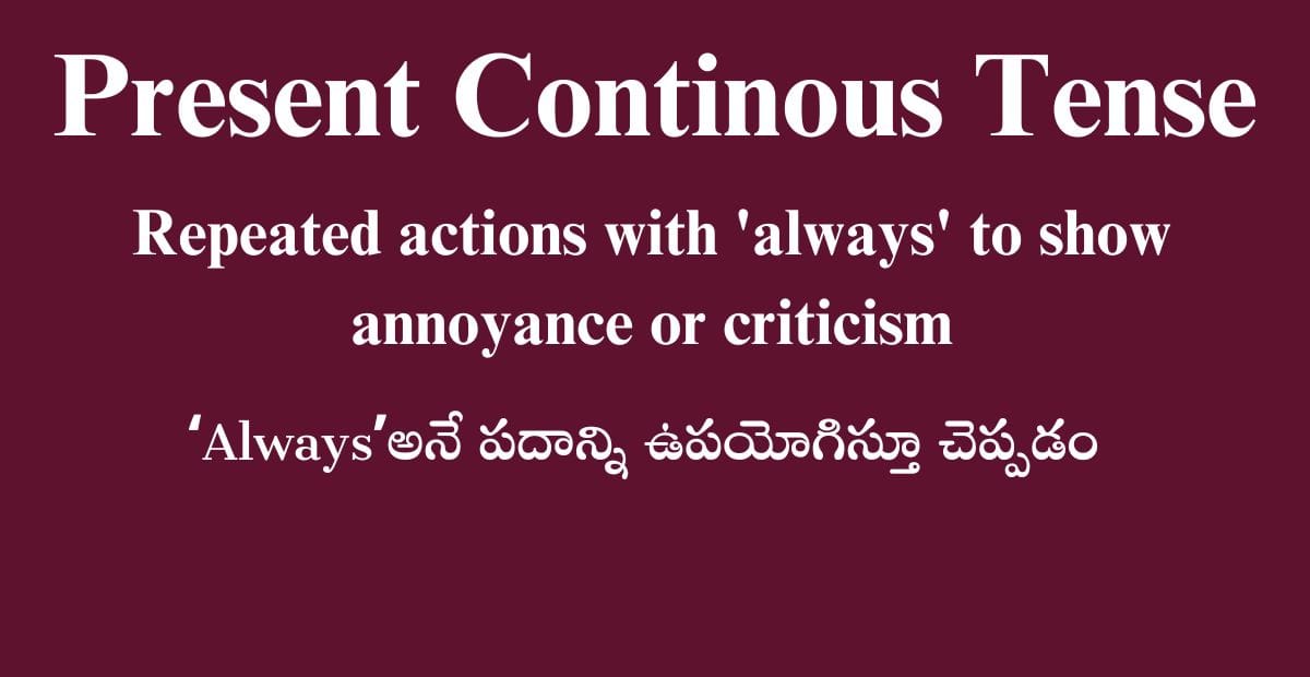 ఎవరైనా ఒక పనిని మరలా మరలా చేస్తున్నప్పుడు, always అనే పదాన్ని ఉపయోగిస్తూ,  ఆ వ్యక్తిని విమర్శిస్తూ లేదా కామెంట్ చేస్తూ ఉన్నప్పుడు కూడా Present continuous tense లోనే తెలియజేస్తారు.