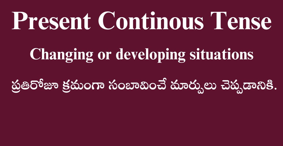 కొన్ని పరిస్థితులలో రోజు రోజుకు క్రమక్రమంగా మార్పు సంభవిస్తావున్నప్పుడు అటువంటి పరిస్థితులను వివరించడానికి కూడా ఈ Present continuous tense ని ఉపయోగిస్తారు.