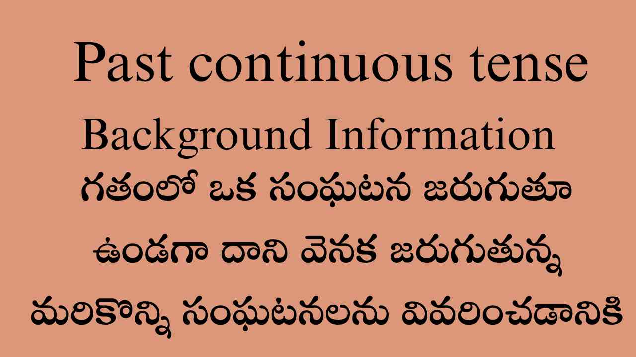 గతంలో ఒక సంఘటన జరుగుతూ ఉండినప్పుడు దాని వెనక జరుగుతున్న మరికొన్ని సంఘటనలను కూడా వివరించడానికి ఈ Past continuous tense ఉపయోగిస్తారు.
