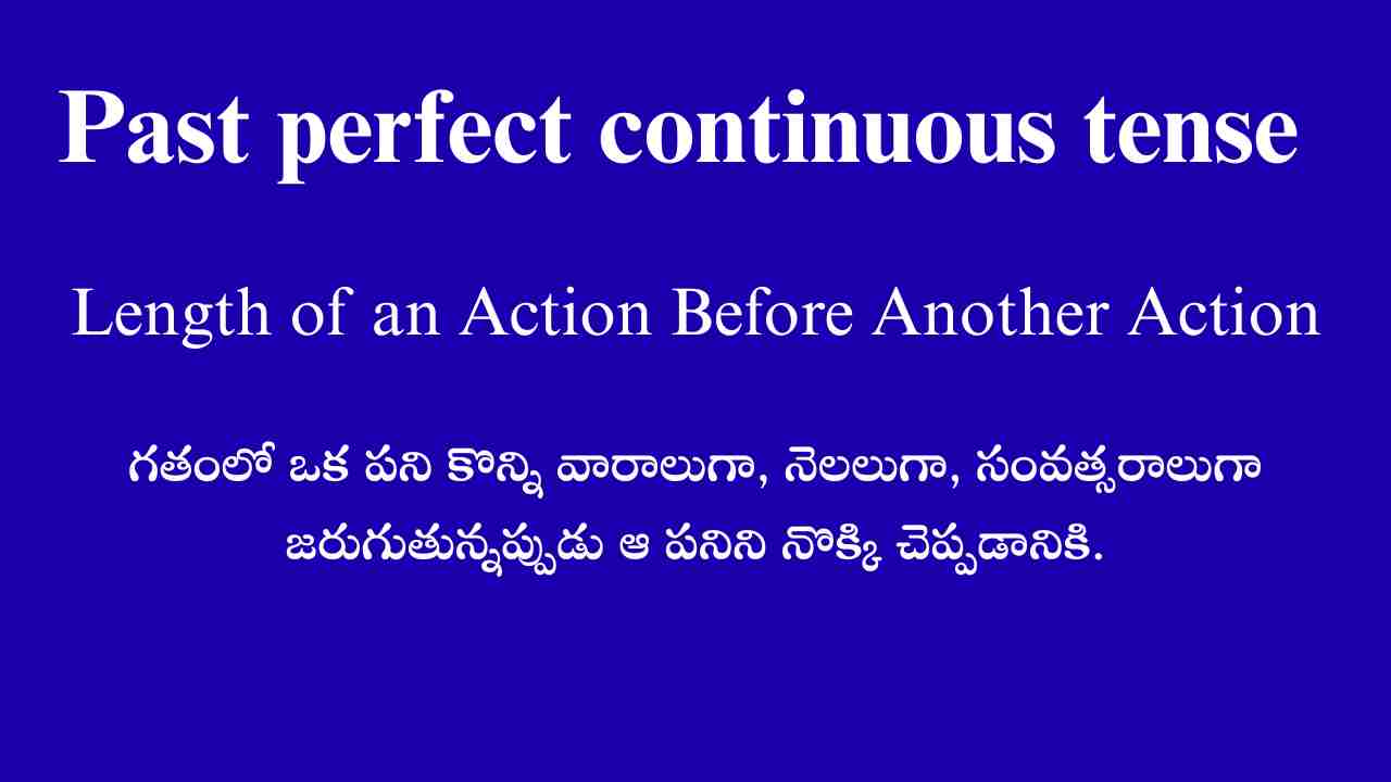 గతంలో ఒక పని కంటే ముందు కొనసాగుతూ ఉండిన మరియొక పనిని తెలియజేయడానికి ఈ Past perfect continuous tense ఉపయోగిస్తారు.