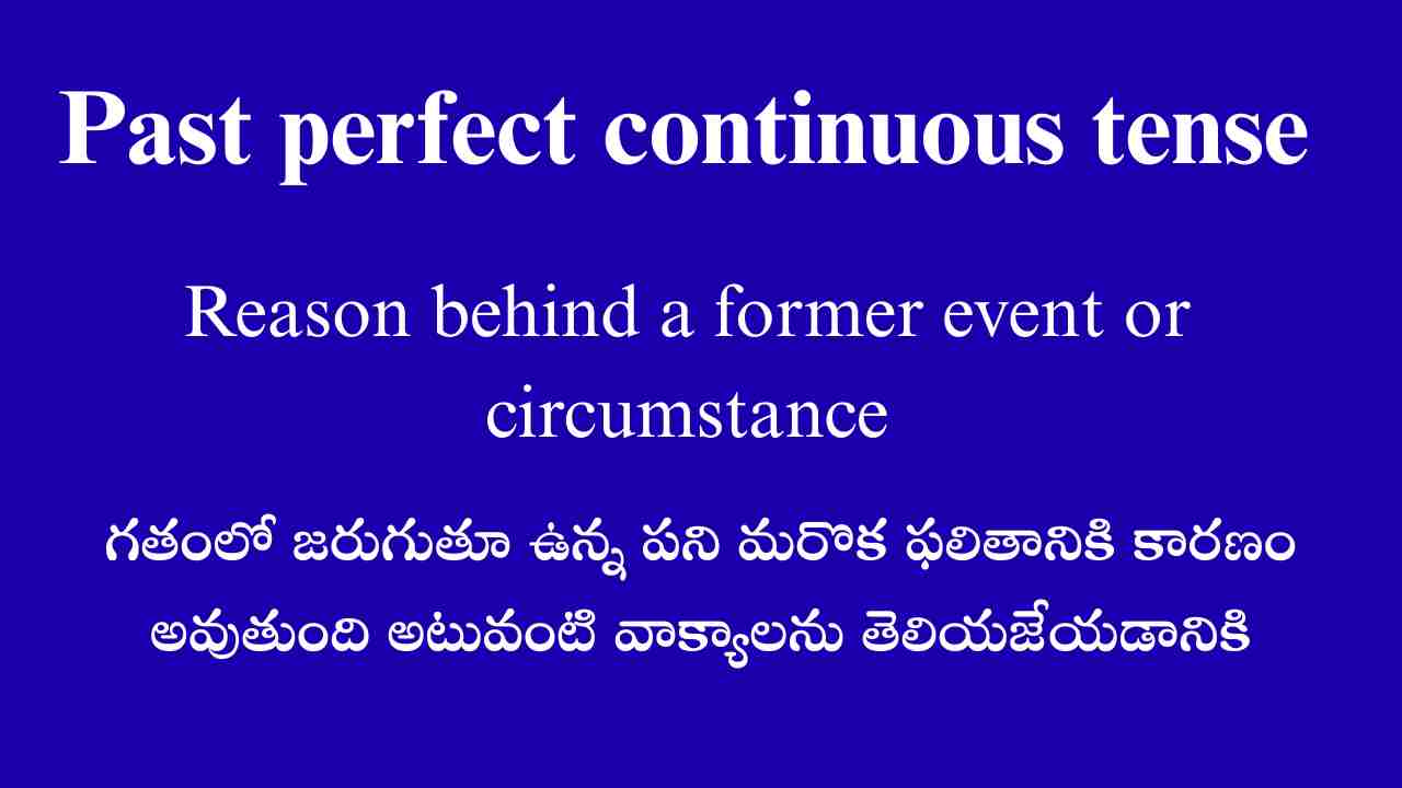 గతంలో జరుగుతూ ఉండిన ఒక పని మరొక ఫలితానికి కారణం అవుతుంది ఇటువంటి వాక్యాలను తెలియజేయటానికి కూడా Past perfect continuous tense ని ఉపయోగిస్తారు.