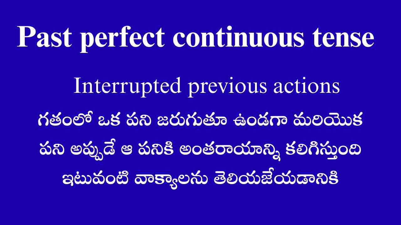 గతంలో ఒక పని జరుగుతూ ఉండగా మరియొక పని అప్పుడే ఆ పనికి అంతరాయాన్ని కలిగిస్తుంది ఇటువంటి వాక్యాలను తెలియజేయడానికి కూడా Past perfect continuous tense ని ఉపయోగిస్తారు