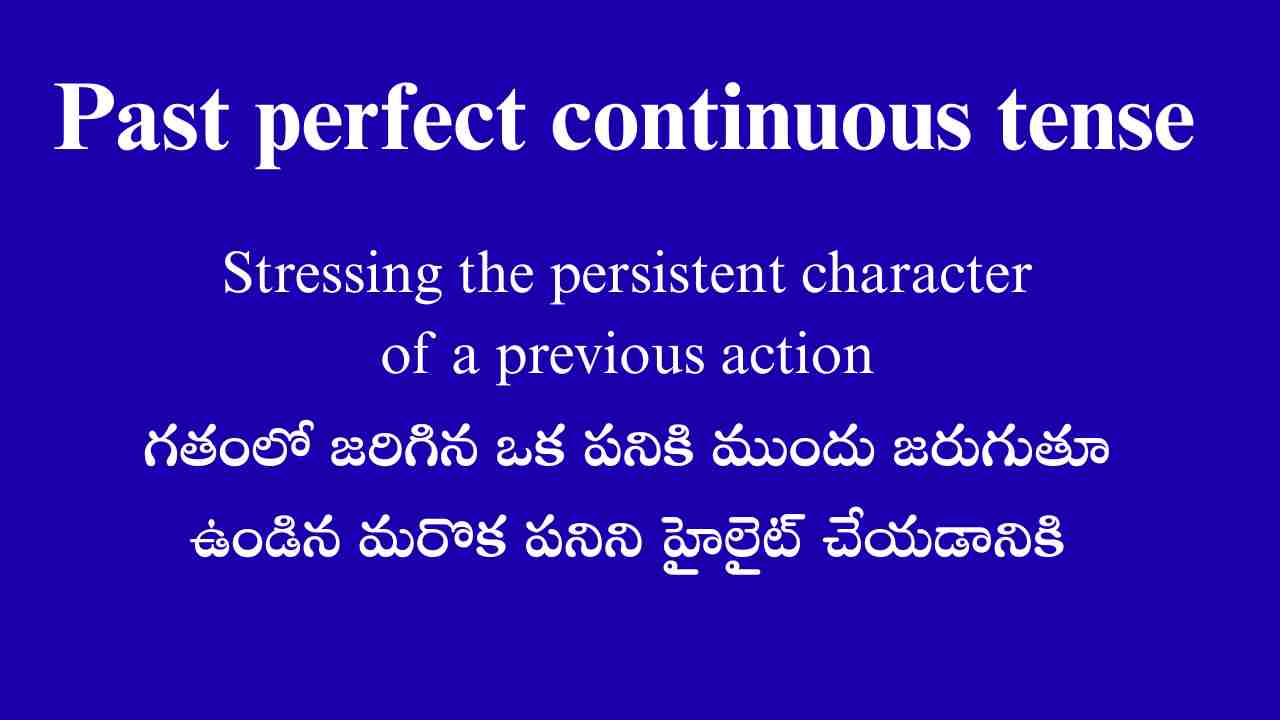 గతంలో జరిగిన ఒక పనికి ముందు జరుగుతూ ఉండిన మరొక పనిని హైలైట్ చేయడానికి కూడా ఈ Past perfect continuous tense ఉపయోగిస్తారు. ఈ Past perfect continuous tense లో అన్ని పాయింట్లు దాదాపు ఒకే విధంగా ఉంటాయి కన్ఫ్యూజ్ అవసరం లేదు.