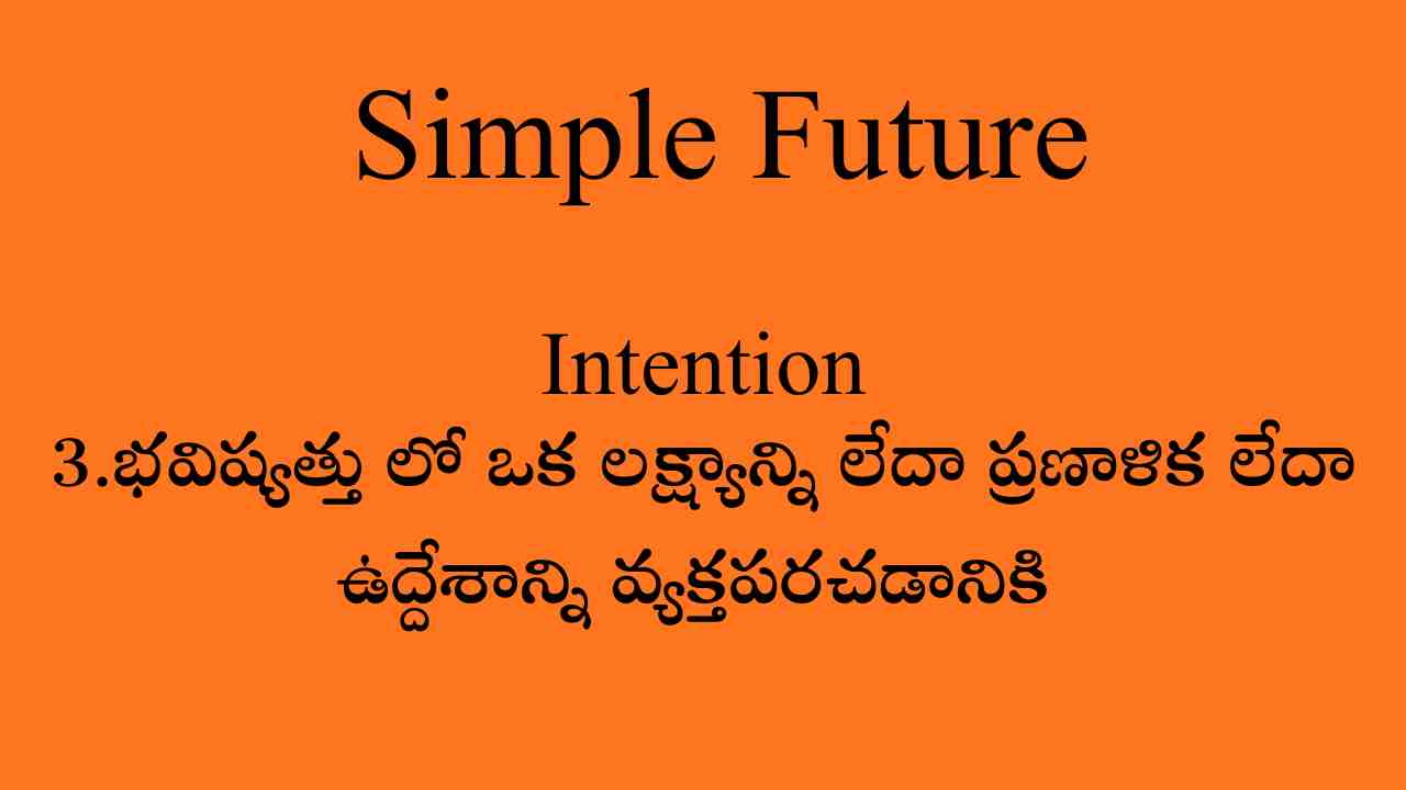 భవిష్యత్తు లో  ఒక లక్ష్యాన్ని లేదా ప్రణాళిక లేదా ఉద్దేశాన్ని వ్యక్తపరచడానికి కూడా simple future tense ఉపయోగిస్తారు.