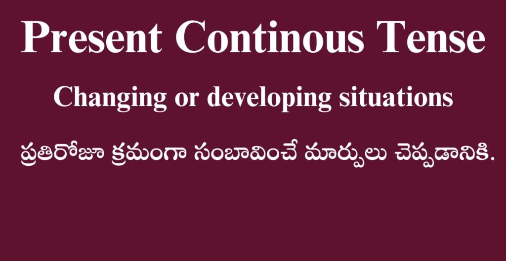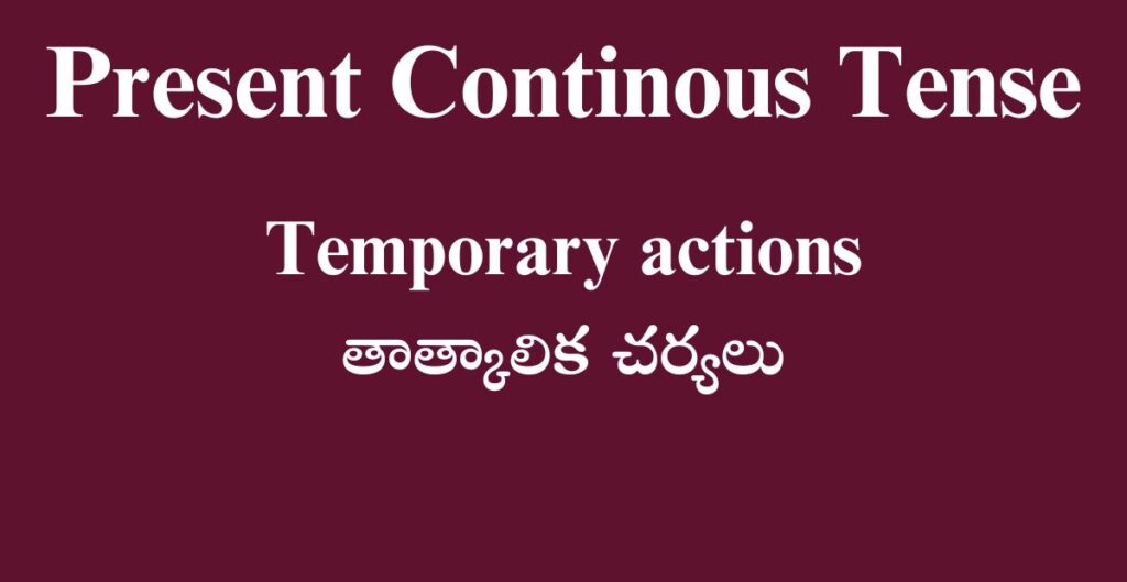 Posted by By Telugufish Spoken English November 15, 2025 2. Temporary actions: Describes actions that are ongoing but temporary. కొన్ని కార్యక్రమాలు ప్రస్తుతానికి కంటిన్యూగా జరుగుతూ…