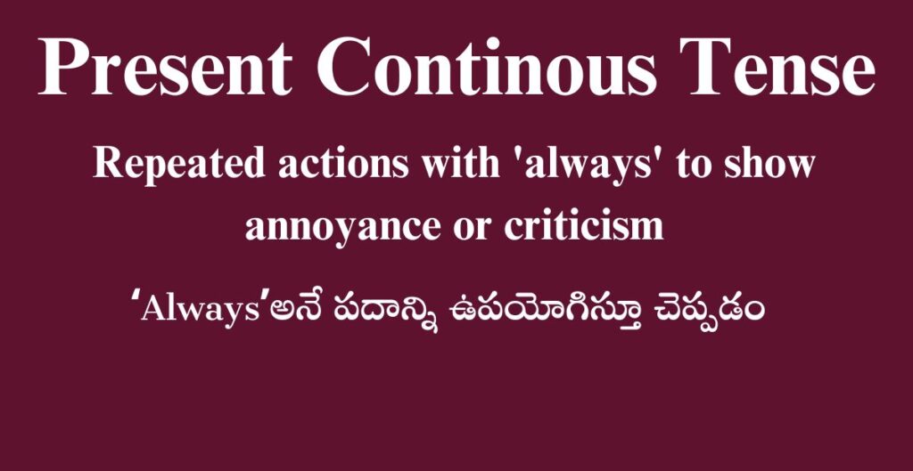Posted by By Telugufish Spoken English November 15, 2025 4. Repeated actions with 'always' to show annoyance or criticism: Describes habitual actions, often with…